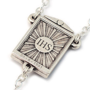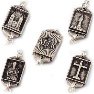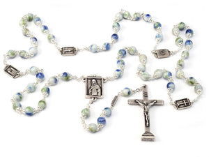 7 mm glass beads, three color hues - Our Father beads featuring the Tabernacle with Saint Jakob, the Križevac Cross, the Podbro Hill and the Medjugorje Church. Antique silver plated finish - Silver plated finish with caps and Ghirelli brand plate - Centerpiece in the shape of the Tabernacle present inside the Medjugorje Shrine. Antique silver plated finish - Crucifix featuring the Križevac Cross - antique silver plated finish