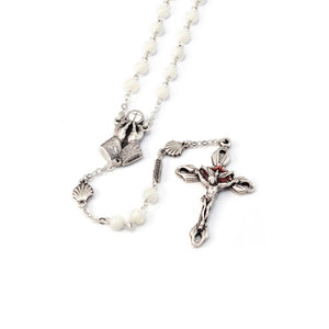 6 mm Mother-of-Pearl beads - “Baptism” Our Father beads in the shape of small shells with antique silver plated finish - Silver plated finish with Ghirelli brand plate - Centerpiece “Consecrating Hands” with hand-decorated Host with white enamel, antique silver plated finish - Crucifix with “Dove of the Holy Spirit”, surrounded by rays, hand-enameled inserts, antique silver plated finish. This Rosary is presented in our exclusive Made-in-Italy hard box with its unique design and accurate details expressing the unmistakable Ghirelli style. The logo on the front of the box appears in relief.