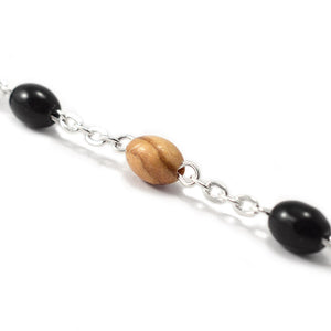 Beads: Oval glass beads in 6x8 mm size and black color and Italian Olivewood accent beads also in 6x8 mm size and subtle tan color