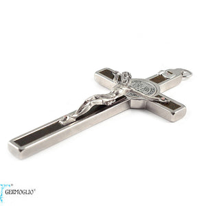 This Saint Benedict Crucifix Wall Cross is made of steel with a silver plated finish. The Saint Benedict Medal and Body of Christ are made from solid brass and plated in a silver finish, and accented with genuine Italian wood inlay on the front.