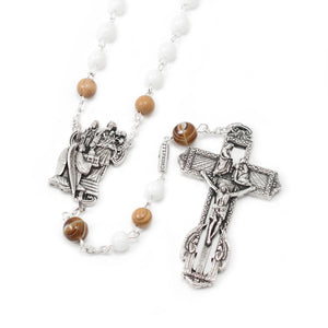 The 6mm white glass beads represent the purity of St. Joseph.