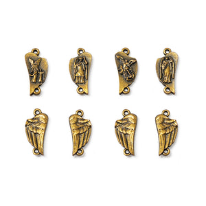 The ornate Crucifix features Our Lord Jesus with two holy angels by his side, the Centerpiece showing Our Lady holding the Christ Child with two holy angels on either side, and four detailed Our Father/Pater medals featuring images of Saint Gabriel, Saint Raphael, Saint Michael, and the Guardian Angels, with identifying text on the reverse side of each medal.