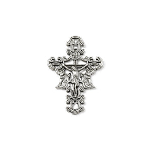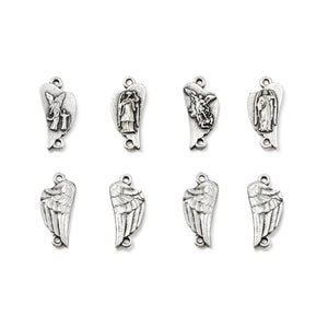 The ornate Crucifix features Our Lord Jesus with two holy angels by his side, the Centerpiece showing Our Lady holding the Christ Child with two holy angels on either side, and four detailed Our Father/Pater medals featuring images of Saint Gabriel, Saint Raphael, Saint Michael, and the Guardian Angels, with identifying text on the reverse side of each medal.