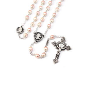 6 mm Bohemian glass beads, two-tone pearly finish - Silver plated finish with caps and Ghirelli brand plate - Official Centerpiece and Our Father Beads of the Beatification of Jacinta Marto in antique silver plated finish - Eucharistic Ostensory crucifix with hand-enameled Host inspired by the Real Presence of Jesus in the Most Sacred Eucharist and by the Gospel passage "I am with you always” Matthew 28:20, antique silver plated finish