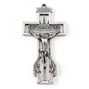 Crucifix: Created for the occasion of the 160th Anniversary of the Apparition at Lourdes, the Crucifix is a unique masterpiece full of meaningful details. Above the imposing Basilica facade there appears a precious crown -- symbolizing the royalty of the Immaculate Conception. At the center Jesus the Eucharist, present in the Ostensory, adored by the Angels