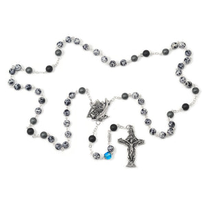 • 8mm genuine hematite beads in a satin/matte finish, in grey color, with accent beads of Bohemian glass positioned on either side of the Our Father beads