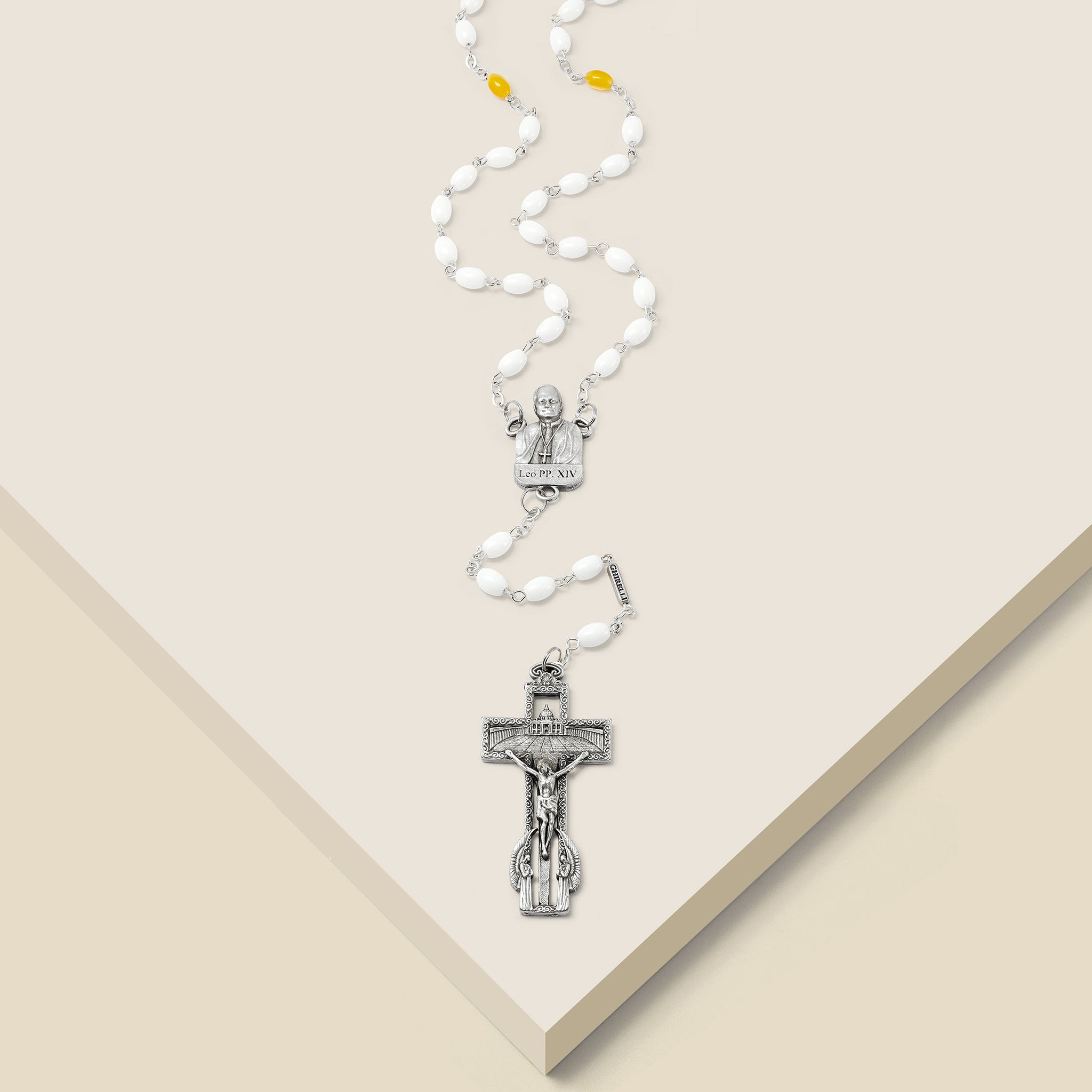 Every detail of this Rosary carries deep spiritual meaning and unique symbolism; from the Crucifix depicting Christ with angels and St. Peter’s Basilica, to the centerpiece with the finely detailed portrait of the Pope and the Virgin Mary with the Gospel promise. The white glass beads symbolize the color of the Roman Pontiff and the yellow mother-of-pearl effect beads recall the colors of Vatican City, the very heart of Christianity.