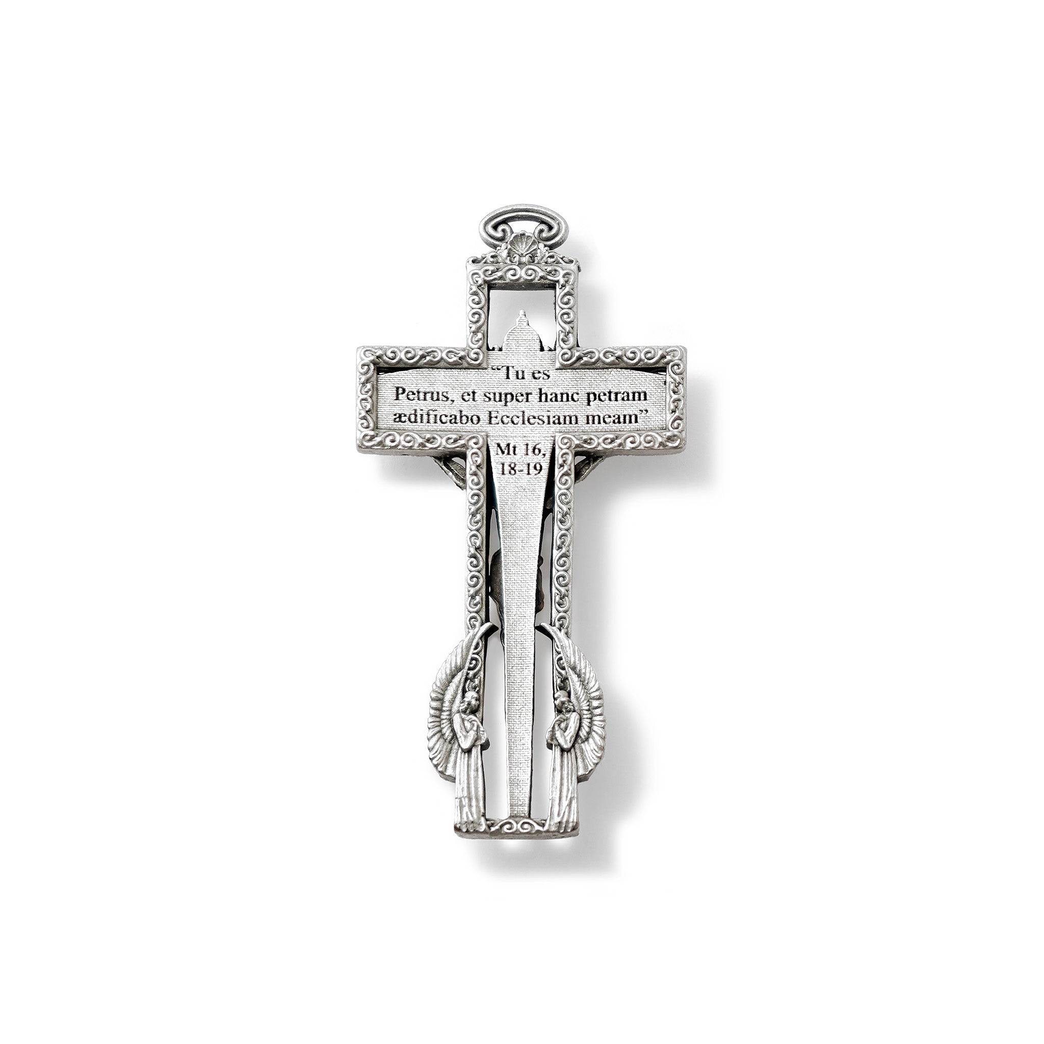 Our beloved Church – One, Holy, Catholic, and Apostolic – is represented by Bernini’s colonnade, which in a magnificent perspective converges toward St. Peter’s Basilica. Symbolically, it is upheld by the pierced hands of Christ, while the angels at His feet adore Him. This artistic depiction proclaims that, despite the trials and persecutions the Church has endured throughout history, it always stands firmly upon Christ, who sustains and guides its through the centuries by means of His Vicar, the Pope. The border of the crucifix is adorned with elegant floral motifs in Baroque style, expressing beauty and sacredness.