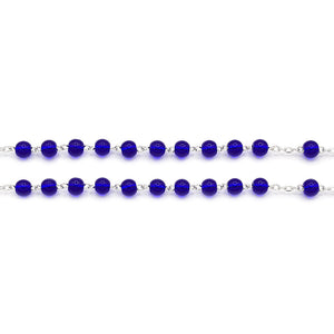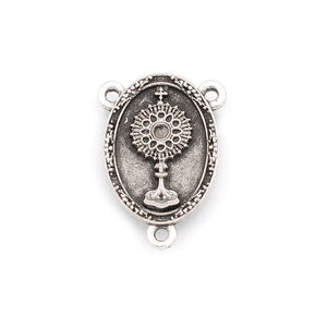 Custom rosary in 6mm Bohemian cobalt blue glass beads. Ornate Crucifix, with IHS insignia and Flame of Love rays emitting from behind Christ. The Centerpiece shows the official Flame of Love image and the Immaculate Heart on the front, and an image of Saint John Paul II's Monstrance of the Blessed Sacrament on the reverse. In Antique Silver finish.