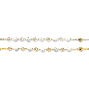 Aulite stones beads in 8 mm size, white with grey veins color. Bohemian glass 8 mm with an elegant round spiral shape, transparent color with golden decorations. Hematite natural stone in 8 mm size in gold polish finish beads.