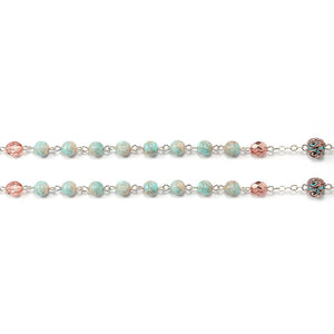 Beads: Bohemian glass faceted beads in 8 mm size and pink color with reflective/transparent effect, and Bohemian glass beads in 8 mm size and multicolored with marble effect. Also includes 8mm hand-decorated accent Lumen Beads