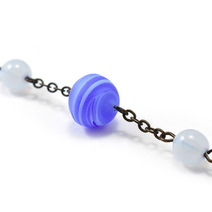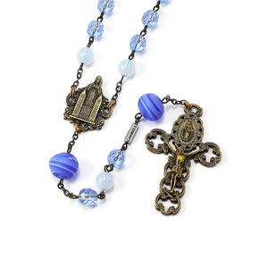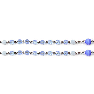 Beads: A combination of Bohemian glass beads in 8 mm size and pastel blue color; Bohemian glass faceted Our Father beads in 8 mm size and sapphire color; and hand blown genuine Murano glass beads in 10 mm size and satin-finish with a vein-effect texture and sapphire color
