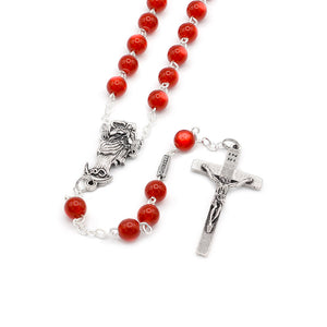 Translucent, faux agate red beads in lightweight lucite. Custom Centerpiece shows in amazing detail a replica of the famed painting of Our Lady, Undoer of Knots by Baroque artist, Johann Georg Melchior Schmidtner. On the back, the script, āOur Lady, Undoer of Knotsā. The beads, inĀ imitation mother-of-pearl, are 7mm in diameter. The Crucifix is a traditional one, with the Corpus of Christ in the center, and tapered edges of the horizontal and vertical crossbars. The rosary is finished in antique silver. Made in Italy.Ā
