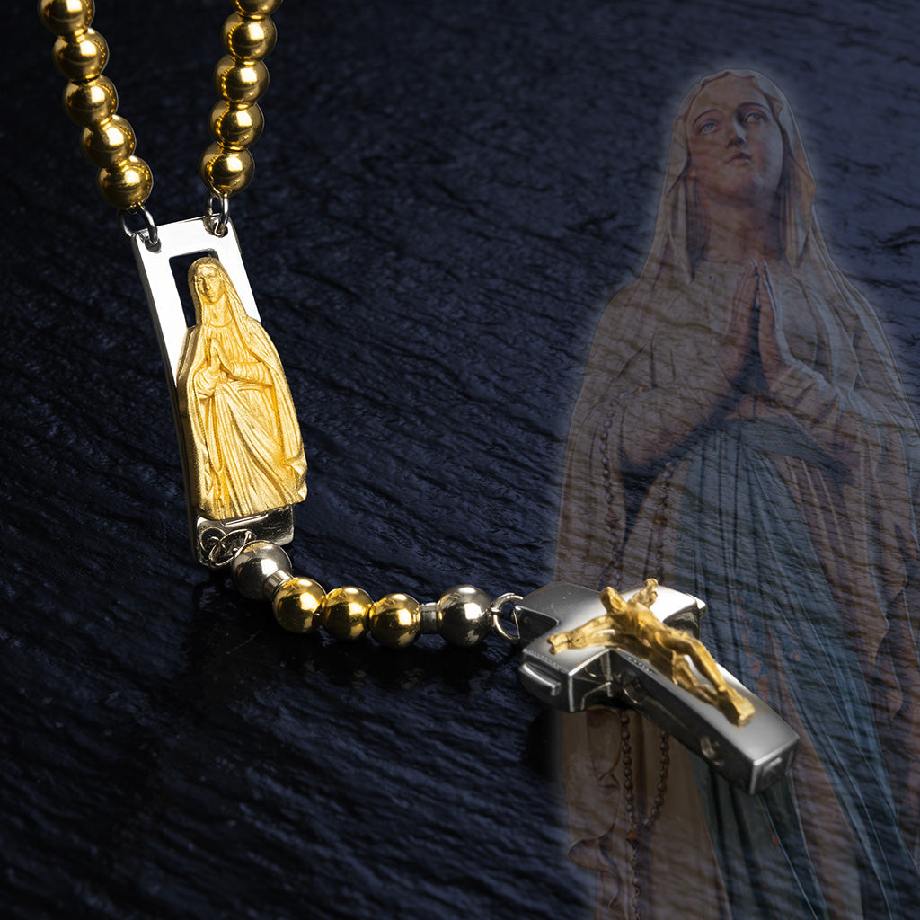 Ogni dettaglio della nostra maison e della nostra maestria rimane invariato. La nostra comunità di clienti è la più amata, e siamo grati che vi uniate a noi in questo viaggio. Guidati dalla preghiera della Madonna del Cielo, ci impegniamo a continuare a onorare Dio con l'eredità dell'artigianato italiano del Rosario che conoscete e amate. Stiamo anche aggiungendo un nuovo modo di indossare l'intero rosario tradizionale sulla vostra persona, ogni giorno. Se state cercando i nostri Rosari tradizionali, sono qui, stiamo ancora sognando nuove varianti e le ultime possono essere trovate in vari posti: provate il nostro ampio menu, usate il pulsante di ricerca per cercare per parola chiave sul nostro sito, o cliccate sul link qui sotto per un'ampia collezione di Rosari Ghirelli Legacy.
