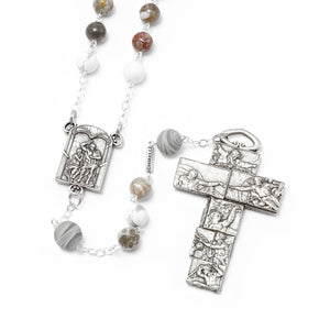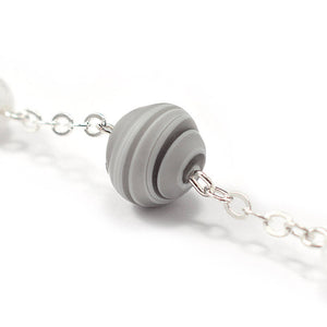 Perle in pietra aulite di 8 mm, di colore bianco con venature grigie. Impreziosite da perle in pietra diaspro naturale di 8 mm e perle in vetro soffiato di Murano autentico di 10 mm, di colore grigio satinato con venature. Per saperne di più sul vetro di Murano: (LA STORIA DEL VETRO DI MURANO).