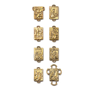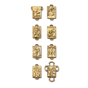 I 16 pannelli metallici, in finitura oro antico, creano un legame spirituale visibile. Ogni pannello rappresenta un momento sacro e importante, un pezzo della storia della Fede che accompagna ogni preghiera, portando con sé la bellezza della tradizione cristiana.