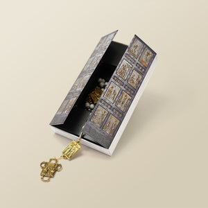 I grani, di 8 mm di diametro, sono un altro elemento centrale di questo rosario. Combinano l'eleganza e la forza di due materiali potenti: L'Aulite, con il suo colore ricco e profondo, che evoca serenità e spiritualità, e l'Ematite satinata, che offre un elegante contrasto, simbolo di protezione e forza. L'interazione tra i pannelli dorati e i grani dalle tonalità uniche aggiunge una dimensione mistica al Rosario, creando un equilibrio tra luce e ombra, tra Fede e arte. Pregare con questo rosario diventa un atto di fede che trascende il tempo, una connessione tangibile con la profonda spiritualità narrata dalla Porta più famosa del mondo.
