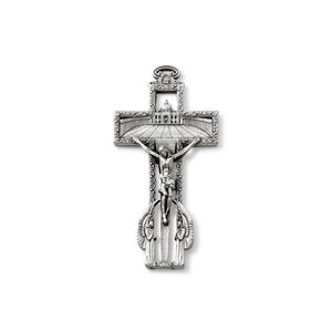 La croce è decorata finemente e presenta un'immagine profondamente spirituale ed evocativa. Al centro si trova la figura del Cristo crocifisso, sorretto e affiancato da due angeli in adorazione. La parte superiore raffigura la Basilica di San Pietro in prospettiva frontale, con il colonnato del Bernini che si estende ai lati, a simboleggiare l'abbraccio universale della Chiesa verso i fedeli. Il bordo della croce è ornato da eleganti motivi floreali, che esprimono bellezza e sacralità.