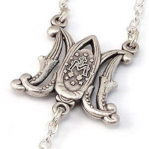 Crocera creata dalla sovrapposizione delle lettere latine "A M" di "Ave Maria", ed inserita al centro la "Medaglia Miracolosa", finitura argento antico;