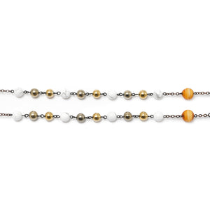 Perle in pietra Aulite da 8 mm, bianche con venature grigie alternate a pietra naturale ematite da 8 mm con finitura lucida bronzo e oro. Perle in vetro soffiato di Murano autentico da 10 mm, color marrone chiaro con finitura satinata e texture “venata”. Per saperne di più sul vetro di Murano: (LA STORIA DEL VETRO DI MURANO)