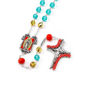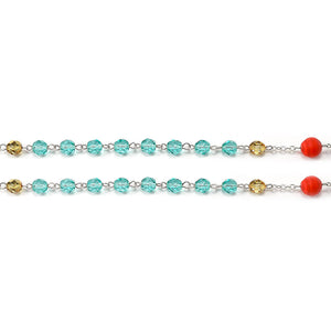 Perle:Vetro di Bohemia faccettato 8 mm acquamarina. Vetro di Bohemia faccettato 8 mm oro con effetto specchio. Vetro di Murano soffiato 10 mm rosso venato satinato
