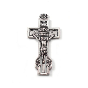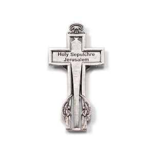 The front of the Crucifix shows Christ Crucified, above him a detailed cast image of the facade of the Shrine that greets pilgrims. On the reverse side, text identifying this holy place.