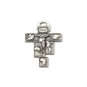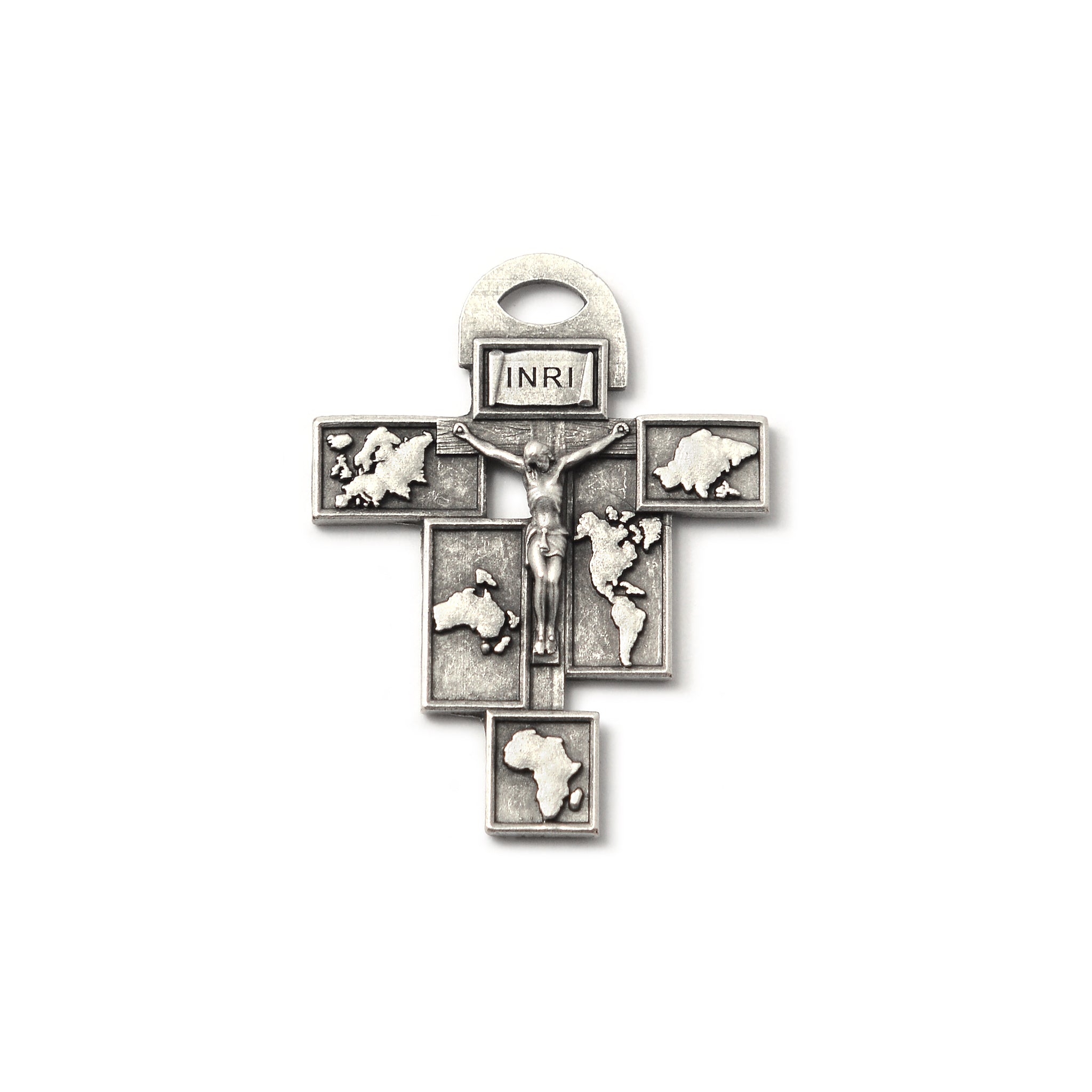 Continents are represented on the unique Crucifix, uniting them with Christ in the pain of wars, poverty, and persecution.In the suffering of people of every race and population.